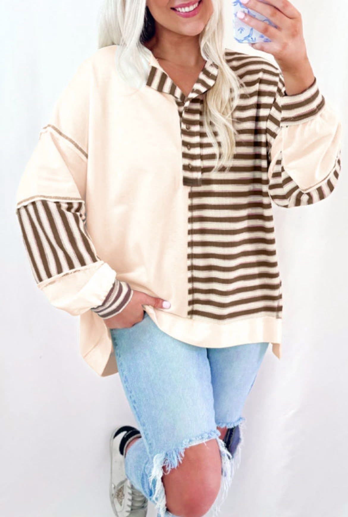 With soft neutral stripes, contrast stitching, and that effortless oversized fit, this pullover gives major boutique vibes while keeping you cozy and cute!
